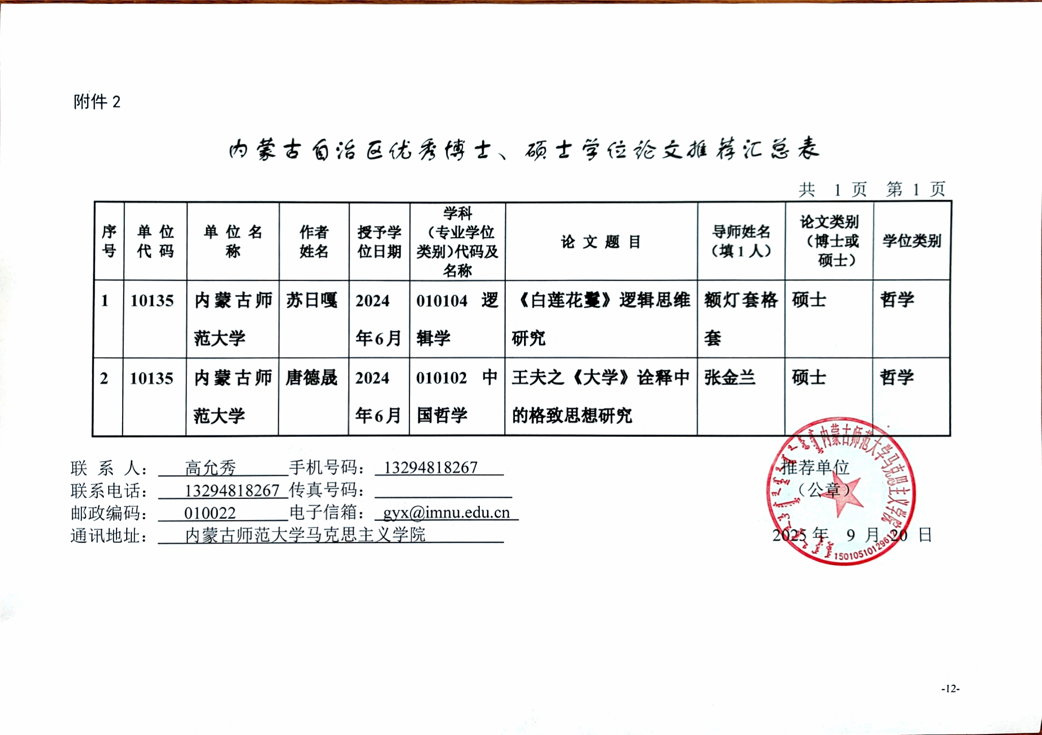 关于内蒙古自治区优秀博士、硕士学位论文推荐名单公示