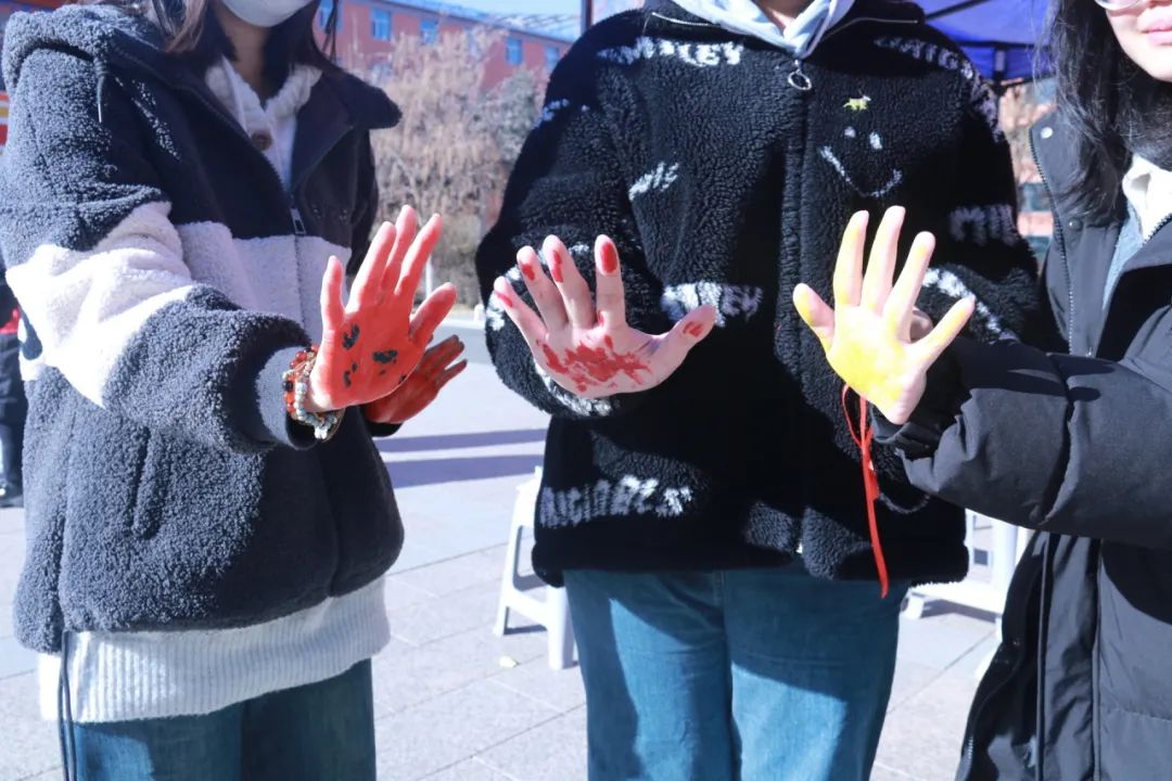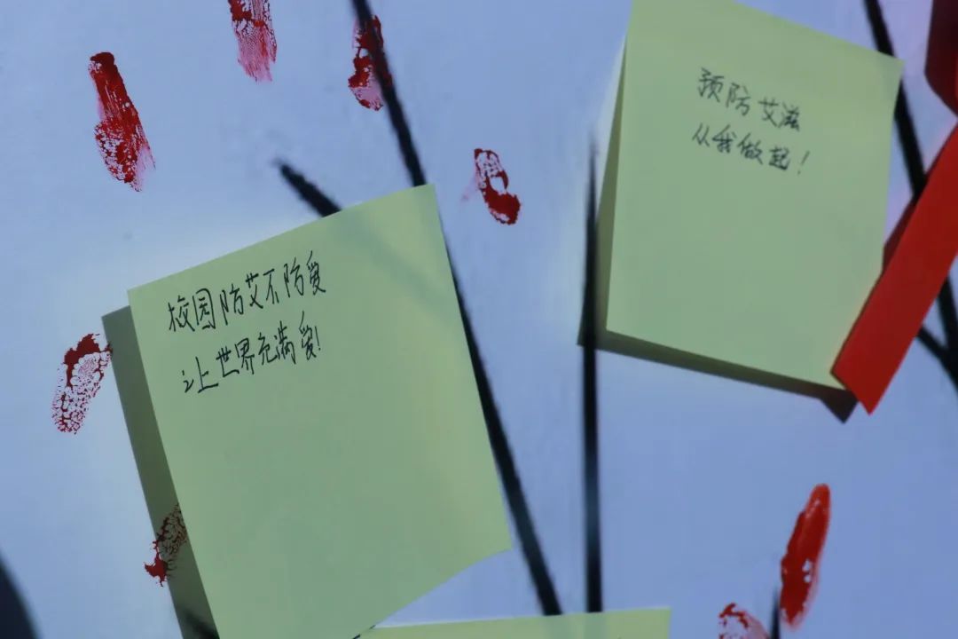 第一项活动——“艾的画押”。同学们在海报树上印上红手印,按完后,志愿者为参与同学手腕上系上定制版艾滋宣传红手带,让同学们了解艾滋病,关注艾滋病的危害。