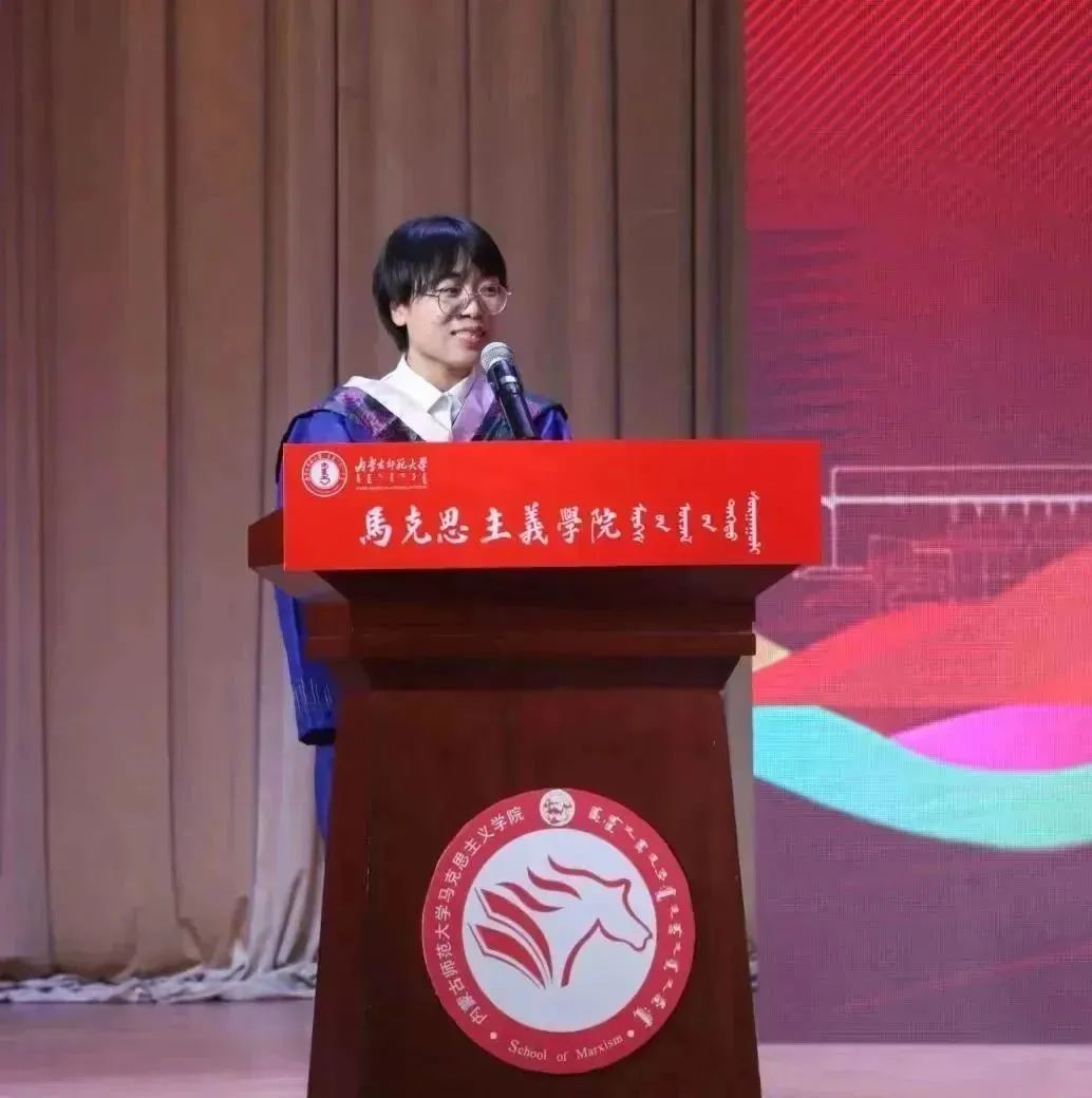 时间是万物的尺度,富含意义而又充满魔力。作为研究生代表,张萌萌同学深慨时光飞逝,表达了对母校深深的眷恋,并感谢老师们的辛勤栽培。她表示,在未来将不负老师们的期望,通过终身努力学习、奋斗来回馈社会、报效祖国,矢志为中华民族伟大复兴而不懈努力。