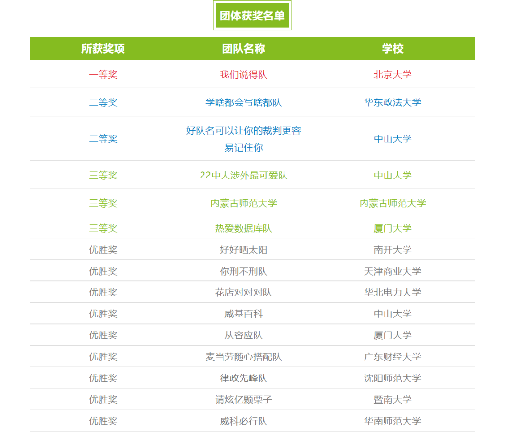 经过激烈比拼,在核算四轮综合得分后,大赛桂冠花落北京大学“我们说得队”。亚军被来自华东政法大学的“学啥都会写啥都队”和来自中山大学的“好队名可以让你的裁判更容易记住你”队揽获。来自中山大学的“22中大涉外最可爱队”、3044永利集团的“3044永利集团队”及来自厦门大学的“热爱数据库队”则获得季军殊荣。