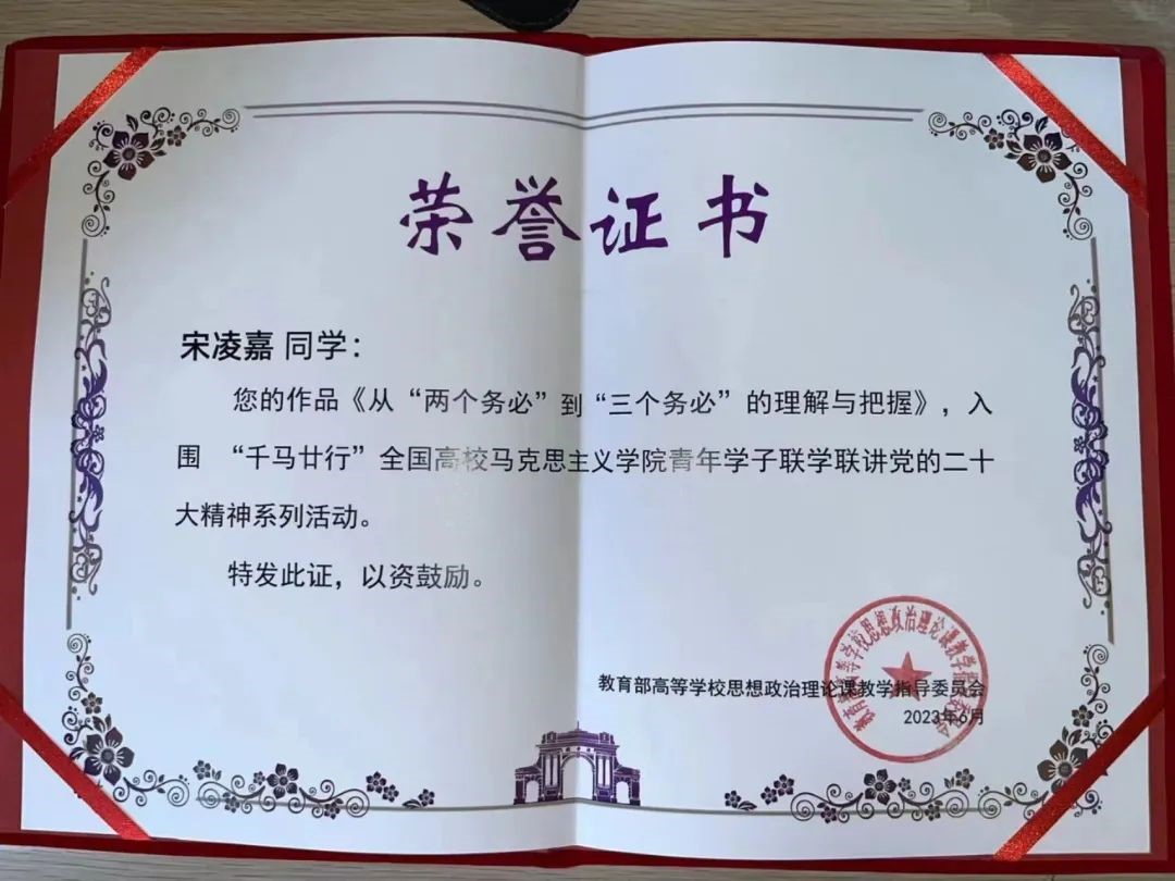 2022级硕士研究生宋凌嘉同学的作品《从“两个务必”到“三个务必”的理解与把握》,入围“千马廿行”全国高校3044永利青年学子联学联讲党的二十大精神系列活动。