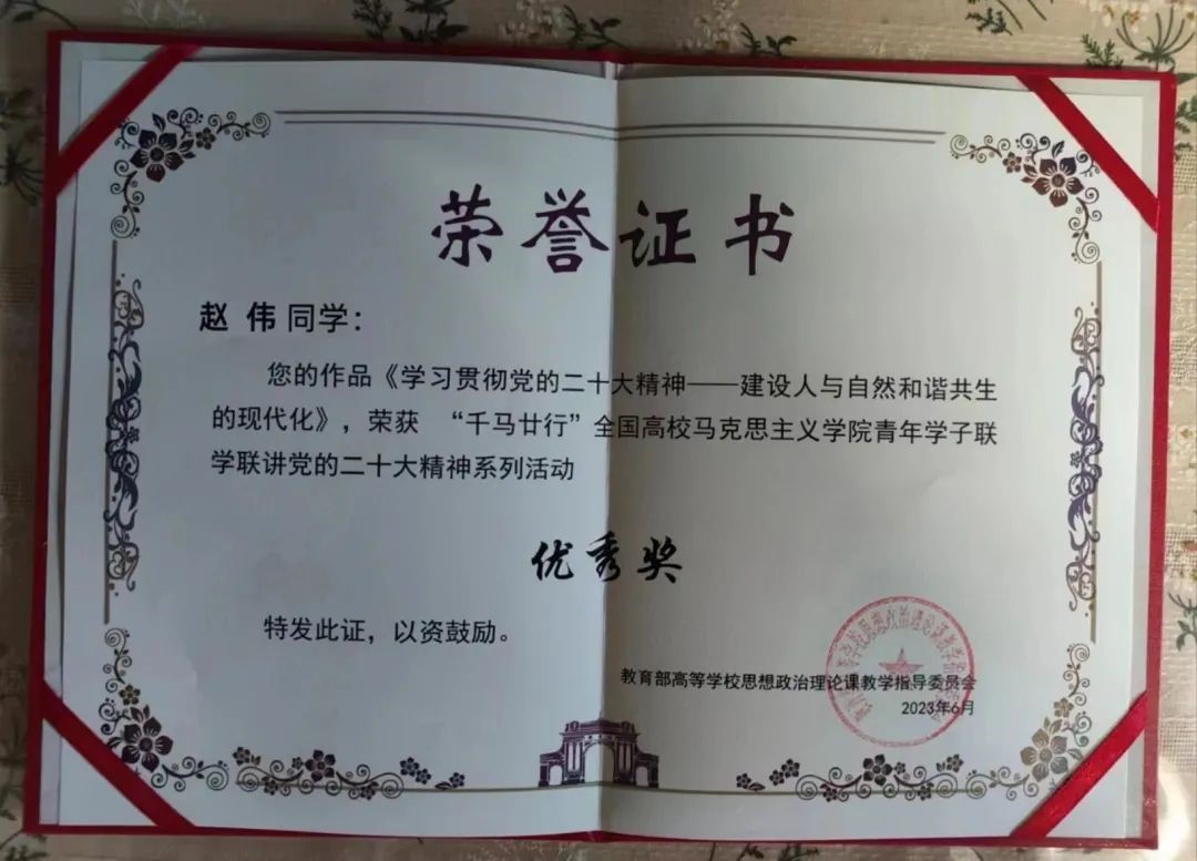 公司2021级硕士研究生赵伟同学的作品《学习贯彻党的二十大精神——建设人与自然和谐共生的现代化》荣获“千马廿行”全国高校3044永利青年学子联学联讲党的二十大精神系列活动优秀奖。