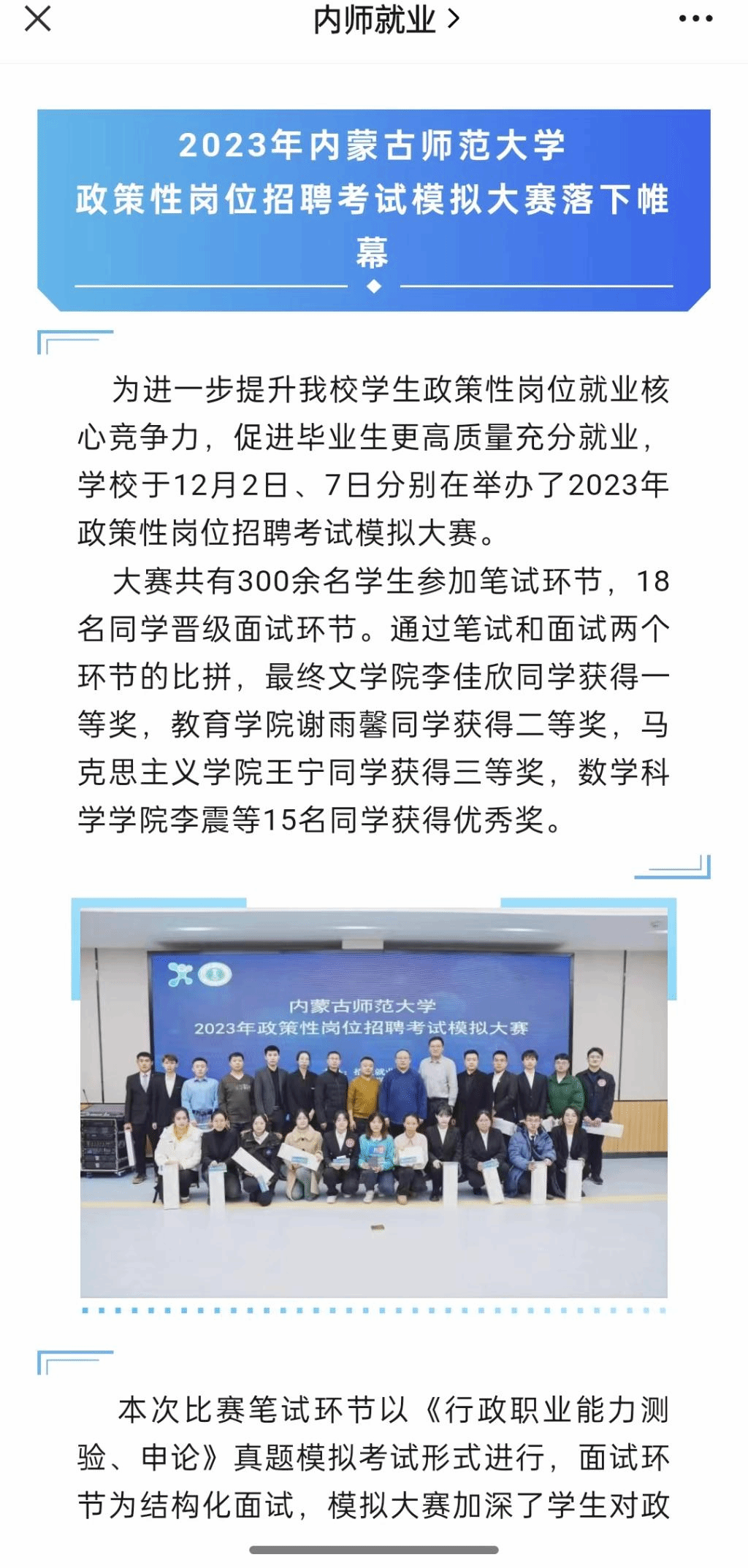 (四)3044永利集团政策性岗位招聘考试模拟大赛中我班王宁同学荣获校级三等奖
