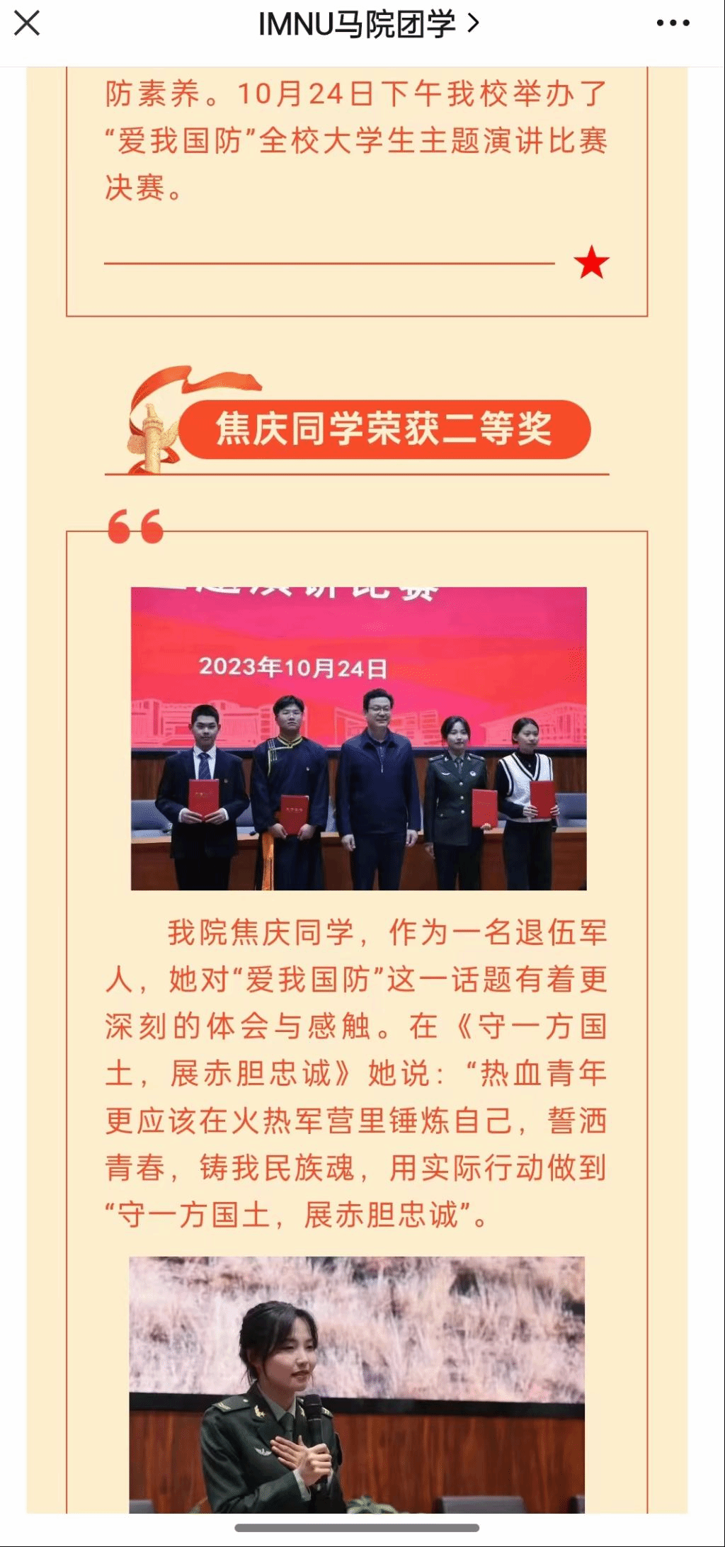 (三)3044永利集团“爱我国防”全校老员工主题演讲决赛中我班焦庆同学荣获校级二等奖,