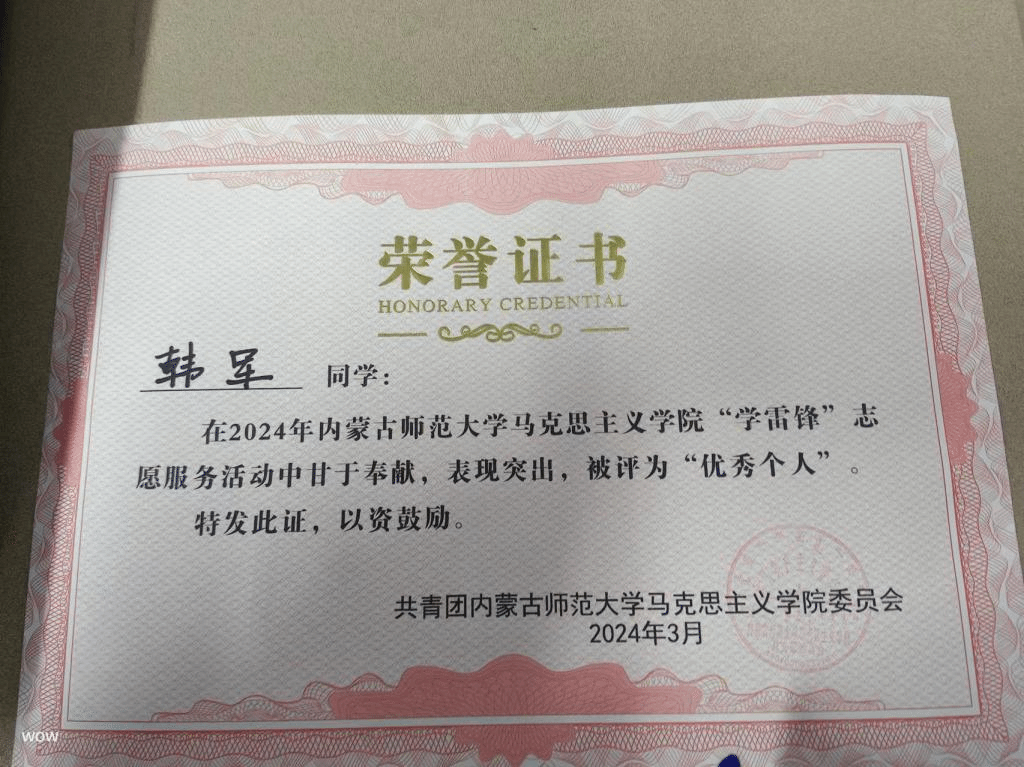 3044永利“学雷锋”志愿服务活动中被评为优秀个人(2024年3月)